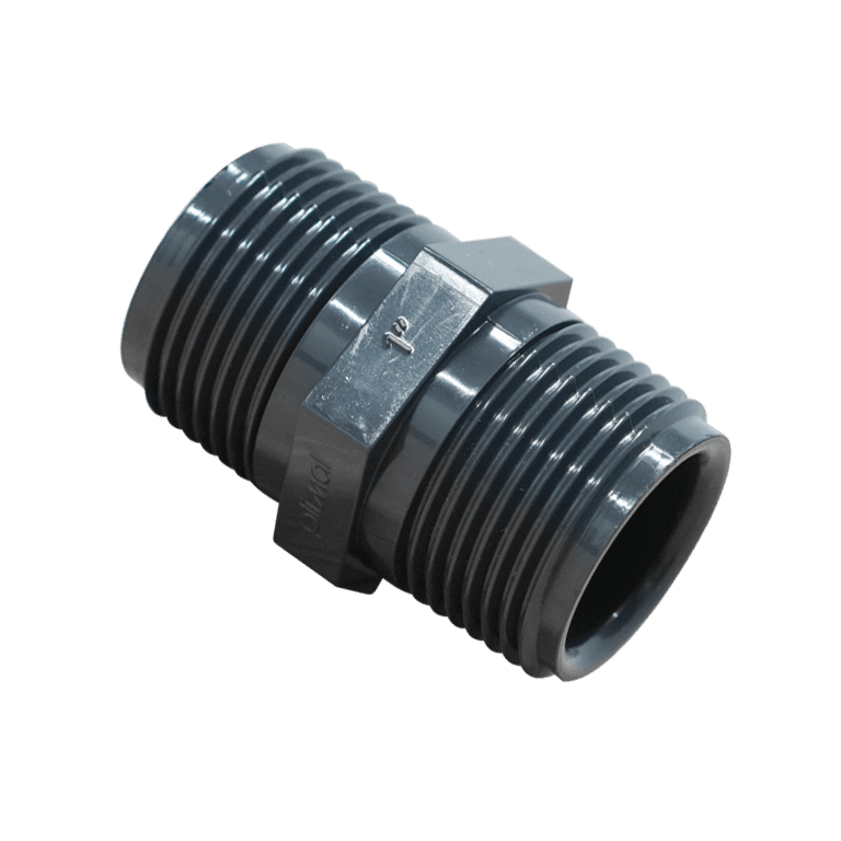 Tlakové PVC závitové hrdlo s dvoma vonkajšími závitovými pripojeniami 1 palec sa používa na spájanie dielov v potrubnom systéme vodného stola.